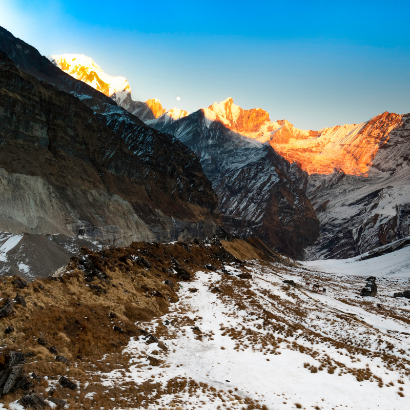 Beginning from the vibrant lakeside city of Pokhara, the trail winds through charming Gurung and Magar villages, dense rhododendron forests, cascading waterfalls, and dramatic mountain landscapes. This trek is ideal for those who want both cultural immersion and high Himalayan scenery in one comprehensive journey.